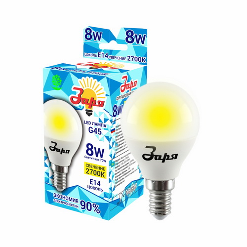 Светодиодные лампы ЗАРЯ - это современные источники света. Лампы шар G45 применяются в осветительных приборах, как альтернативные галогенным лампам с цоколем GU5.3, GU10 и лампам накаливания с цоколем Е14, Е27.