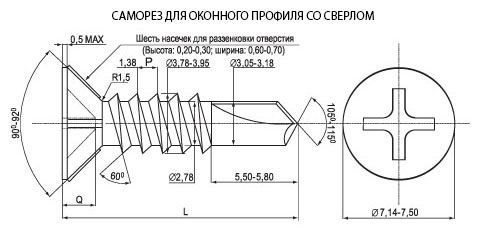 Особенности и применение: Потайная головка с насечками для раззенковки, резьба с мелким шагом под углом 60 градусов, специальное утолщенное сверло помогают быстрому и качественному монтажу армированного оконного профиля.