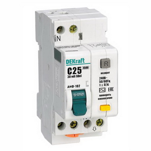 Дифавтомат 2п (1P+N) C 25А 30мА тип AC 4.5кА ДИФ-102 2мод DeKraft 16005DEK